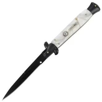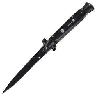 The Italian stiletto is one of the most iconic knives in history due to its long history and proven style. This stiletto has an integrated vertical slide safety, push button operating system, and the blade is released by pushing the front wing guard from right to left. Beautiful pocket knife with stainless steel bolster, single edged bayonet style blade.